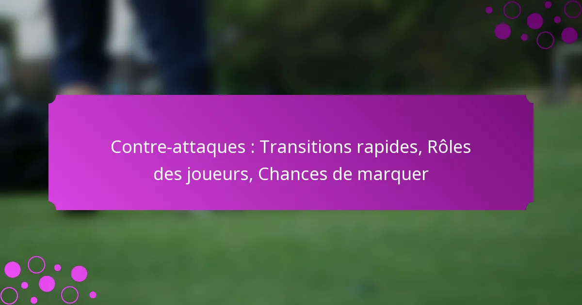 Les contre-attaques au football sont des actions dynamiques qui se produisent immédiatement après avoir récupéré la possession, conçues pour tirer parti du désarroi de l’adversaire. Cette stratégie met l’accent sur des transitions rapides de la défense à l’attaque, nécessitant que les joueurs agissent rapidement et de manière cohérente pour créer des occasions de marquer avant que l’équipe adverse ne puisse se réorganiser. Le rôle de chaque joueur est crucial dans ce processus, avec des responsabilités spécifiques qui renforcent l’efficacité de la contre-attaque.